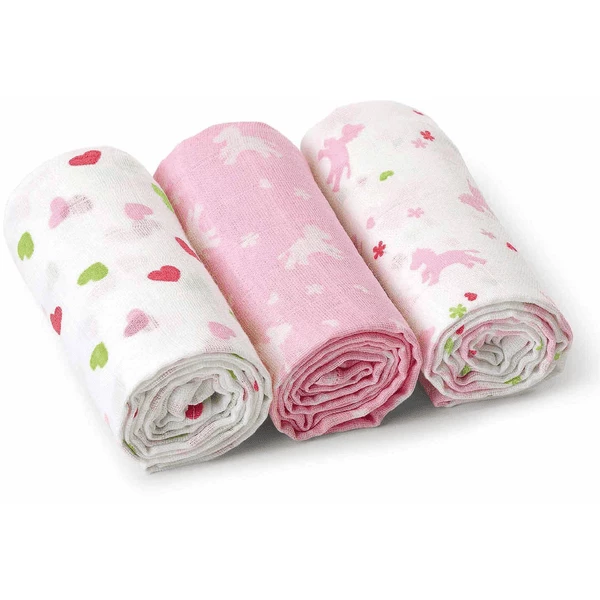 Sterntaler 3x 3er Bundle Mulltücher Pferde Egal ob dein Baby gerade zahnt oder die ersten Essversuche versucht oder du dein Baby stillst – die Mulltücher im 3er-Set sind ein absolutes Must-Have für die erste Babyaustattung. Die Mullwindeln aus einem atmungsaktivem Baumwollstoff sind vielseitig einsetzbar und erweisen sich als tolle Helfer im Alltag mit Baby und Kind. Egal ob als Spucktuch, Lätzchen, Kuscheltuch, als Tuch zum Pucken oder auch als Sonnenschutz im Auto oder am Kinderwagen – die quadratischen Mulltücher sind angenehm leicht und gleichzeitig saugfähig. Artikeldetails: Abmessung: ca. 80x80x0,2 cm cm Material: 100% Baumwolle Lieferungsumfang: 3x 3er Mulltücher Farbe: weiss, rosa, grün Pflegehinweis: Normalwaschgang 60° Chlorbleiche nicht möglich, Trocknen mit reduzierter thermischer Belastung, Mässig heiss bügelnMaterialanteil: 100% BaumwolleTrocknergeeignet: JaWaschhinweis: Waschbar bei 60°C